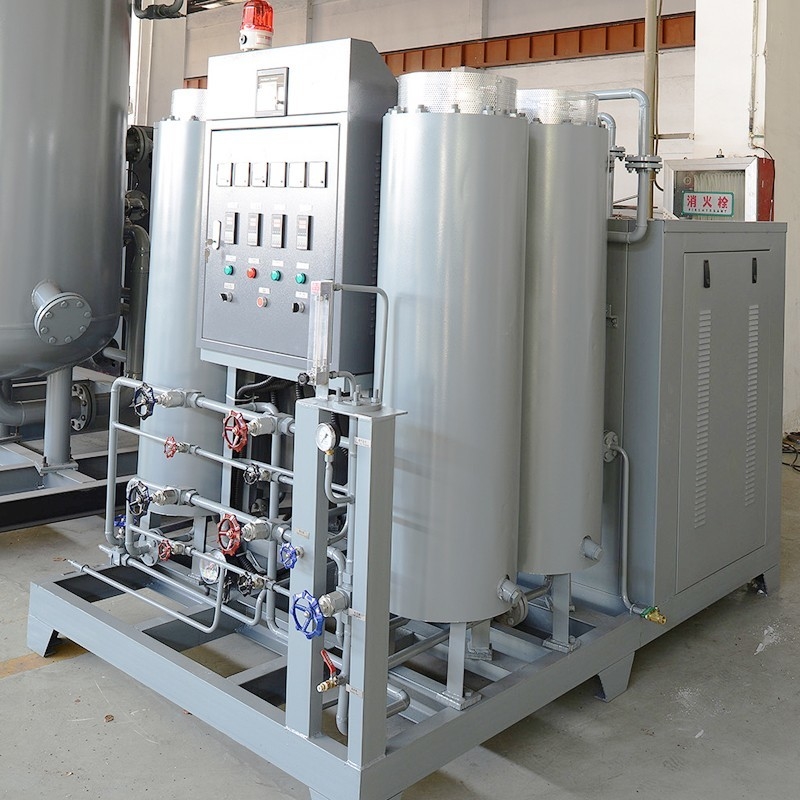 アンモニア分解装置は、ニッケル触媒を利用して、吸熱反応下でアンモニアを分解または分解し、水素と窒素の混合物にします。アンモニアクラッカーの原料はアンモニアガスであり、このガスはシリンダーで容易に入手できます。アンモニアが触媒を通過すると、8500℃の温度で分解が起こり、75%の水素と残りの25%の窒素を含むN2 + H2混合物に分解されます。分解されたアンモニアガスには、約80 PPMの未分解アンモニア不純物が含まれており、その露点はわずか300℃です。クラッカーの周囲には特別なタンクがあり、そこで窒素と水素が分離されます。水素は窒素の14倍軽いため、タンクの上部に上昇し、タンクの底にある特別なリリーフバルブから窒素が排出されます。